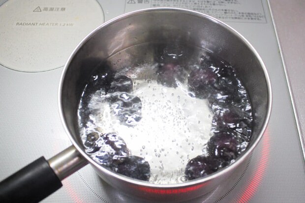 沸騰したお湯で、巨峰を30秒ほど茹でて…。