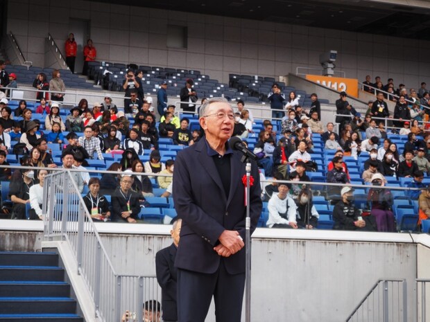 「この大会は41年前に当時の陸連会長から、当財団の安藤百福に小学生の陸上大会を応援してほしいと打診されたことで始まった。当時は中高生の大会はあったが、小学生の大会は無かったそうだ。今回は“スポーツと食”に関するオンラインセミナーも開催している。食とスポーツは健康を支える車の両輪のようなものという理念が、この陸上大会にもつながった。もう一つ伝えたいのは、財団ではグローバルチャレンジというプログラムだ。85人の選手を支援しているが、世界陸上やオリンピックに参加する上でも役立っていると考えている。皆さんも数年のうちにグローバルチャレンジに参加してほしい。さて今日は皆さんの記録に期待している。これまでは8月、9月に開催していたが、今回2~3か月後になったことで、皆さんの体格も大きくなっている。聞くところによると、1か月に1cmくらい背が伸びるという。そしてこの天候だ。暑い夏よりも皆さんにとってベストなコンディションだと思う。常日ごろ培ってきた皆さんの実力を大いに発揮してほしい」。
