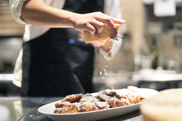 セレモニー後には、パルミジャーノ・レッジャーノを贅沢に使用したフィンガーフードや、日本酒とのペアリングといった、日伊の食文化を融合させたテイスティング体験を提供。さらに、ボットゥーラ氏が推奨し、チーズ生産者の復興に大きく貢献したレシピ「リゾット・カチョ・エ・ぺぺ」を再現したデモンストレーションと試食も実施した。