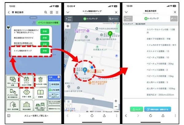 これらの情報は、東広島市の公式LINEアカウント内の「イベント・お出かけ情報」メニューから、「トイレ情報共有マップくん」にアクセスして確認することができる。