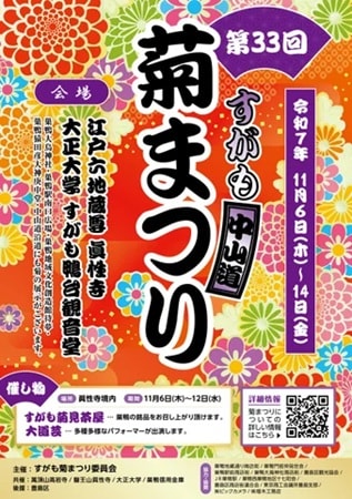 江戸六地蔵尊眞性寺境内・大正大学すがも鴨台観音堂に、丹精込めて育てられた菊が展示される「すがも中山道 菊まつり」が、11月6日(木)~14日(金)の期間で開催される。