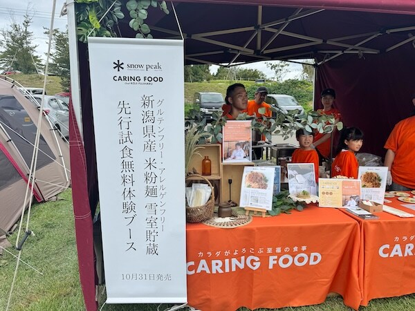 今回発売する「雪室米粉麺」は、9月25日(木)に発表したスノーピークとケアリングフードの共同開発による新商品で、新潟県産の雪室熟成米粉を使用した28品目アレルゲンフリー、グルテンフリー対応のアウトドアフードだ。「誰でも食べられるキャンプ飯」をコンセプトに、自然と調和した“やさしいおいしさ”を追求した。