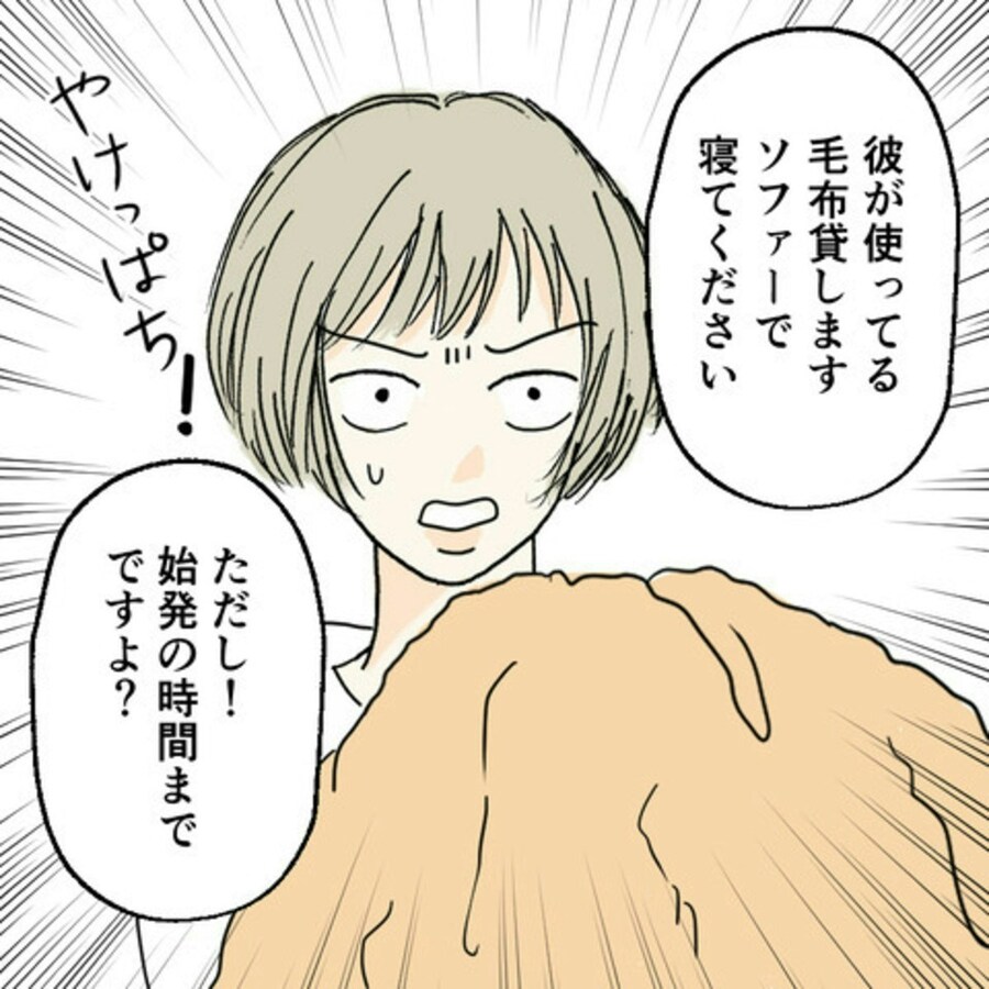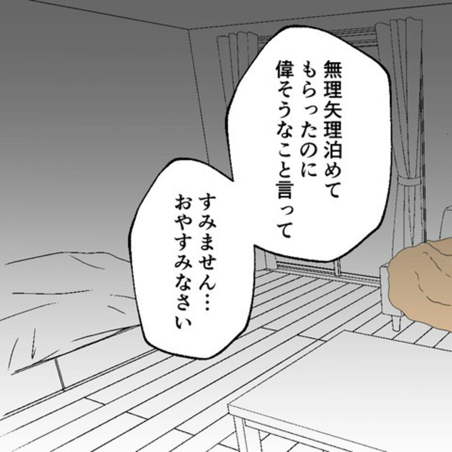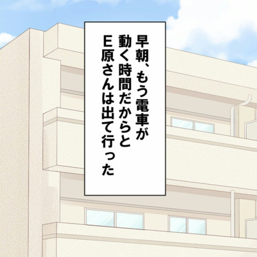 S葉に「何もしないから始発まで部屋の隅に置いてくれ」と懇願するE原。S葉は困りつつも放っておけず…。