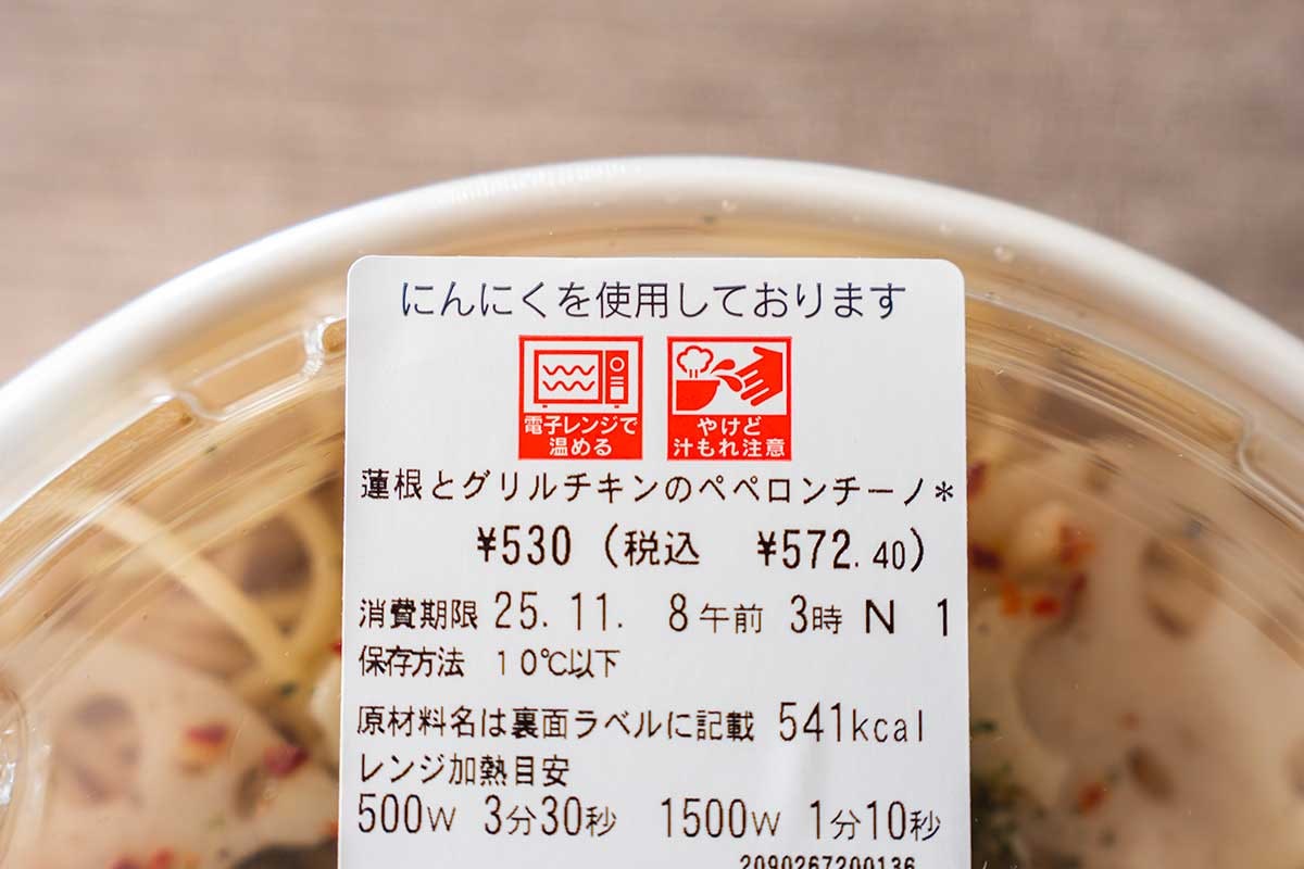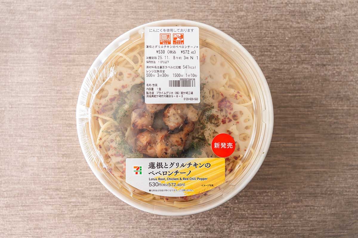セブン-イレブンは2025年11月5日(水)に、「蓮根とグリルチキンのペペロンチーノ」(税込572.40円)を発売しました。