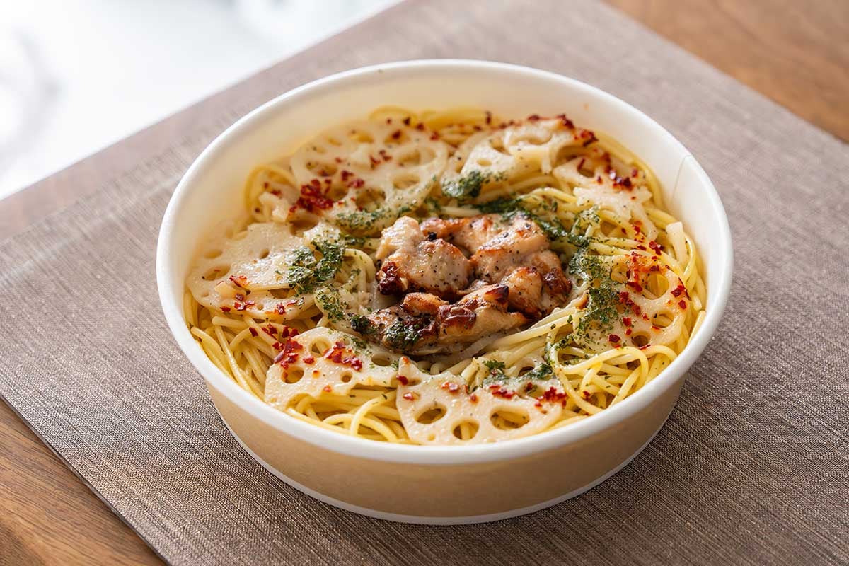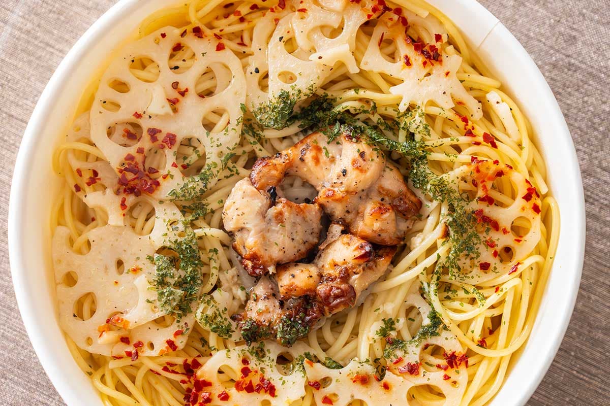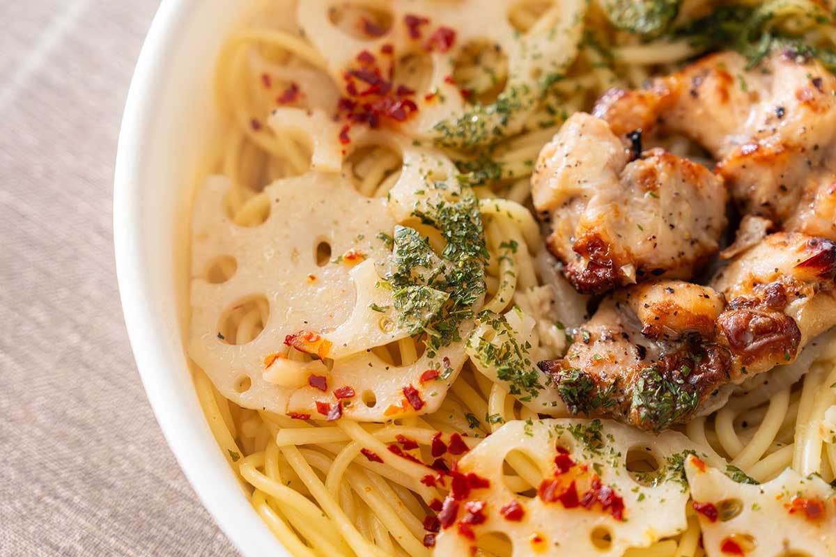 この商品は、蓮根とグリルチキンを盛り付け、にんにくをきかせたオイル仕立てのパスタです。
