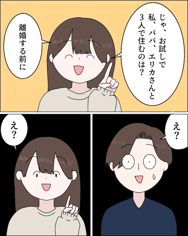 すると、「じゃ、お試しで私、パパ、エリカさんと3人で住むのは?離婚する前に」と提案するジュリに、「え?」と驚く夫。その言葉にジュリも「え?」と言いました。