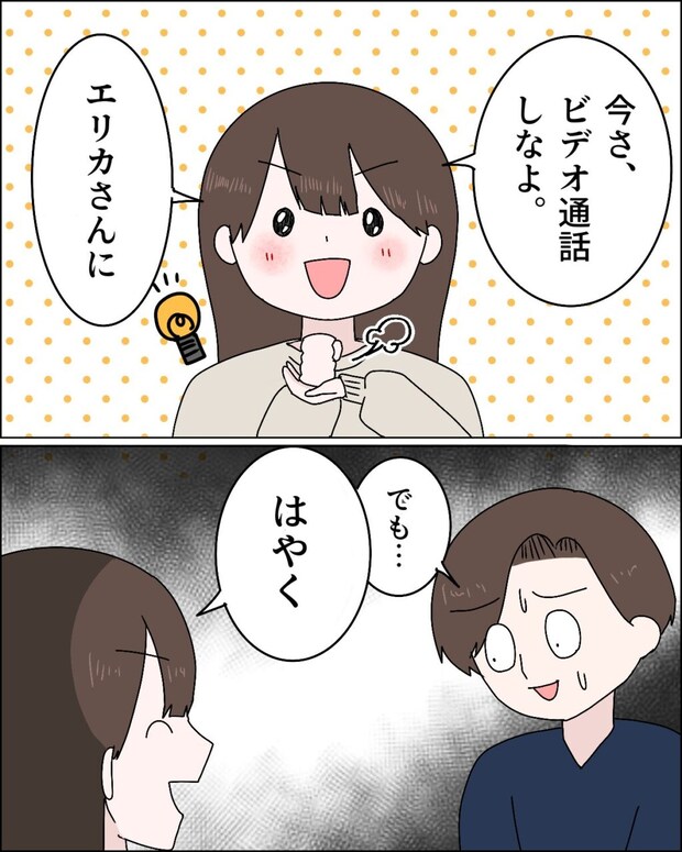 そして、「今さ、ビデオ通話しなよ。エリカさんに」とイイコト思いついた!とばかりに言い出すジュリに、「でも・・」と全く気が進まない夫。ジュリは「はやく」と笑顔で急かしました。