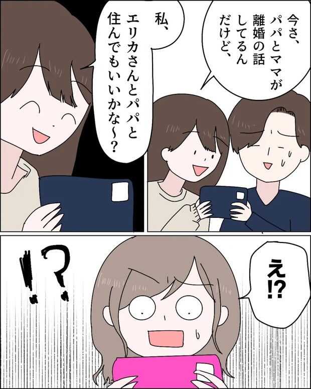 「今さ、パパとママが離婚の話してるんだけど、私、エリカさんとパパと住んでもいいかな~?」ジュリが笑顔でそう言うと、「え!?」電話越しのエリカさんはビックリしました。