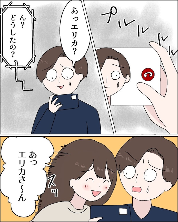 仕方なくエリカさんに電話した夫は、「あっエリカ?」電話がつながると、「ん?どうしたの?」とエリカさん。動揺する夫の横から「あっエリカさ~ん」とスマホに向かって話すジュリは、