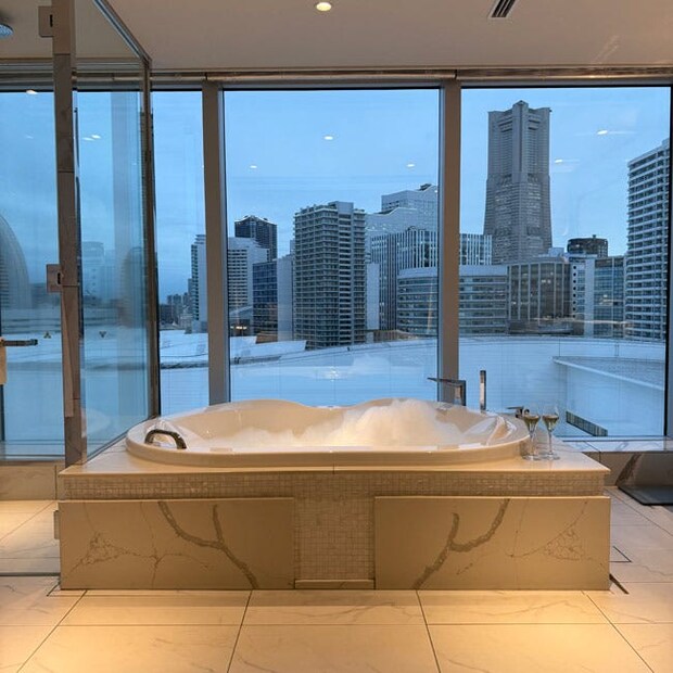 バスルームの窓もワイドサイズで、みなとみらいの景色を一望。夜はビル群の明かりや大観覧車のライトアップがきれい