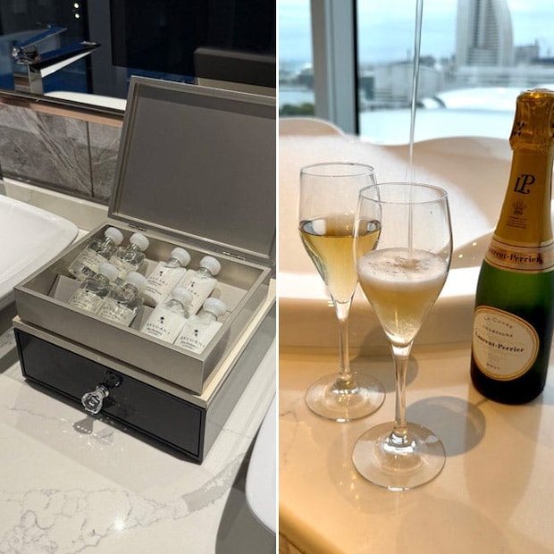大理石があしらわれ、広々としたバスルームも、横浜らしい景色を一望できるビューバス仕様。みなとみらいのビル群や大観覧車が目の前に見え、特に日が暮れてからは夜景がきれい。備え付けのアメニティでバブルバスも楽しめるので、景色を眺めながら優雅なバスタイムが満喫できる。こんな特別な体験をプレゼントすれば、パートナーもきっと喜んでくれるはず。お風呂上がりにはバスローブに着替え、2人だけのくつろぎタイム。スイートルームは客室のミニバー無料の特典付き。2人の大切な日に、スパークリングワインで乾杯しよう。