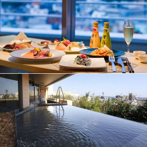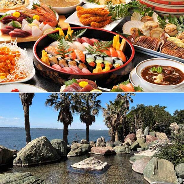 上/ディナービュッフェには約60種類の和洋中メニューが並ぶ。生ビールやワインも飲み放題 下/男性用展望大浴場の外湯。女性用のお風呂もオーシャンビューで開放的