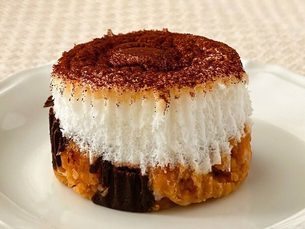 アメリカの定番スイーツとして親しまれている「スモア~マシュマロ&生チョコ~」。ビスケット生地の上に生チョコとマシュマロを重ねており、上からココアパウダーがかかっています。