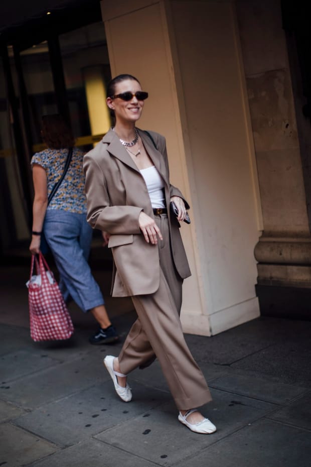 レザーシューズやヒールのあるシューズを選びがちなスタイリングにもハマる、バレエシューズ。実はドレスダウンにぴったりな1足。