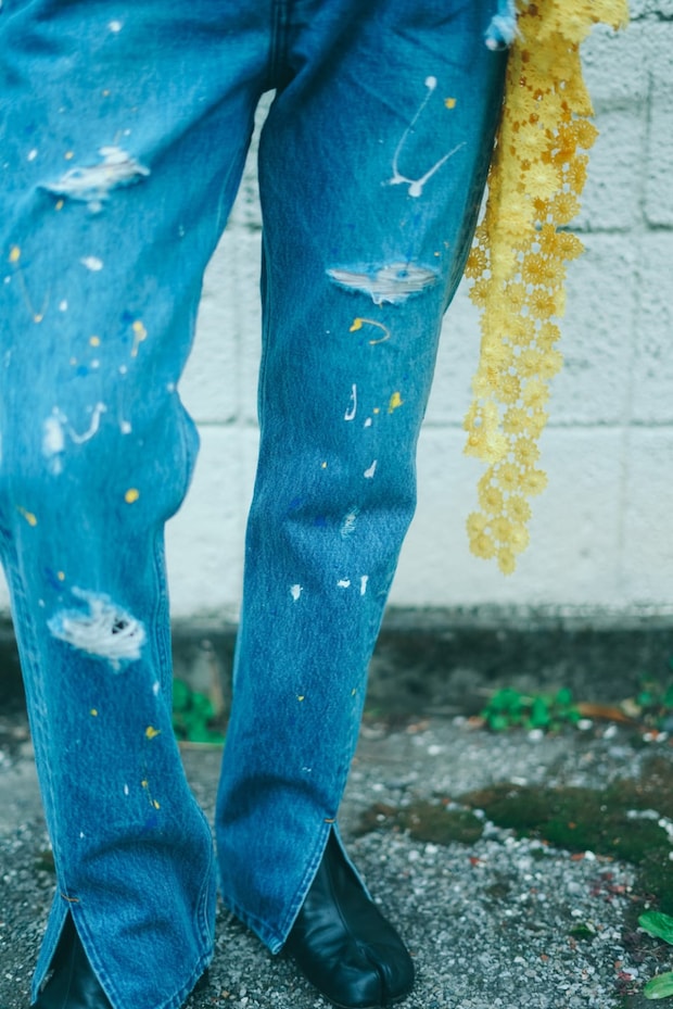 「経年変化によるリアルなペインティングを再現しながら、色をビビッドにアップデートしてファッション性を加えています。美脚を叶えてくれるシルエットに本格的なヴィンテージ風加工を施した自信作です」パンツ¥32,200(157ウォードブルー/ヤマツゥ)