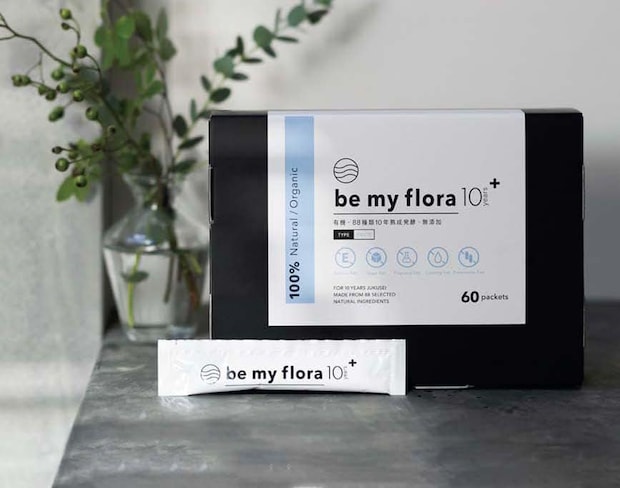 有機栽培の野菜や果物を発酵させ、乳酸菌をプラス。be my flora 10年熟成酵素+ 60包 ¥19,500(REBEAUTY)