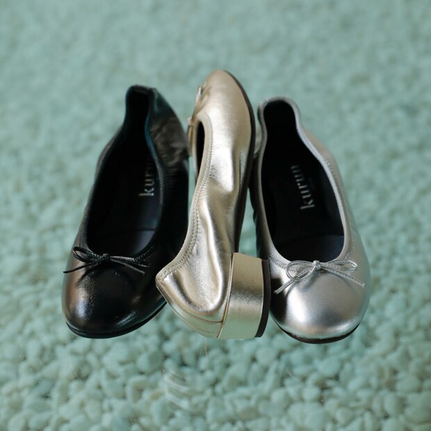 「世界一はき心地のよい靴で世界中の人を笑顔に」をコンセプトに掲げるバレエシューズブランド、kurun TOKYO(クルン トウキョウ)の、ヒール付きバレエシューズです。浅草のアトリエで熟練の職人たちによって作られたバレエシューズは、2019年よりオンライン販売からスタートし、足に吸いつくようなソールの柔軟性や軽量性(片足なんと約100g!)などに注目が集まり、瞬く間に人気ブランドに。