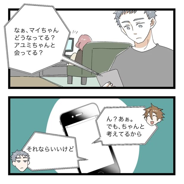 ダイスケさんが『なぁ、マイちゃんどうなってる?アユミちゃんと会ってる?』とヒロトさんにメッセージを送ると、『ん?あぁ。でも、ちゃんと考えてるから』と返信がきました。ダイスケさんはヒロトさんの「ちゃんと考えてる」という言葉を信じてそれ以上は何も言いませんでした。