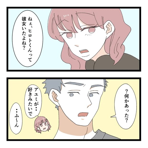 ヒロトさんはダイスケさんの友達、アユミさんはダイスケさんの彼女リサさんの友達でした。リサさんはヒロトさんに彼女がいることを知っていたため、アユミさんからヒロトさんのことが好きだと相談されて「ねぇ、ヒロトくんって彼女いたよね?」とダイスケさんに確認しました。ダイスケさんは「・・ふ~ん」と素っ気なく答えながらも2人の関係が気になりました。