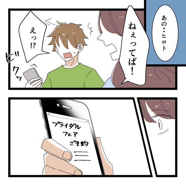 数日後、ヒロトさんと会ったアユミさんは「あの・・ヒロト」と話しかけますが、ヒロトさんはスマホに夢中。「ねぇってば!」と大きな声を出すと、ヒロトさんは「えっ!?」と驚いて振り向きました。その時、ヒロトさんのスマホの画面にブライダルフェアの予約画面が見えたアユミさん。