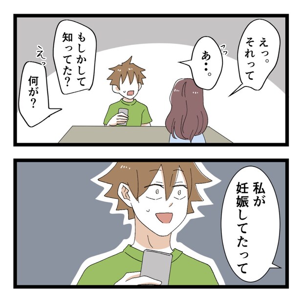 アユミさんが驚いた様子で「えっ。それって・・」と呟くと、「あ・・」と気まずそうなヒロトさん。「もしかして知ってた?」と聞かれ「えっ。何が?」と困惑するヒロトさんに、アユミさんが「私が妊娠してたって」と静かに言いました。アユミさんからのまさかの一言にヒロトさんは固まります。
