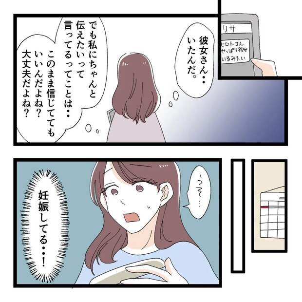 リサさんから『ヒロトさんやっぱり彼女いるみたい』と聞いたアユミさんは「彼女さん・・いたんだ」とショックを受けますが、「俺からちゃんと伝える準備をさせてほしい」と言っていたヒロトさんの言葉を思い出し「でも、私にちゃんと伝えたいって言ってるってことは・・このまま信じててもいいんだよね?大丈夫だよね?」と自分に言い聞かせます。しかし、しばらくして妊娠が発覚。ヒロトさんとの関係が曖昧なままだったアユミさんは「うそ・・」と動揺します。