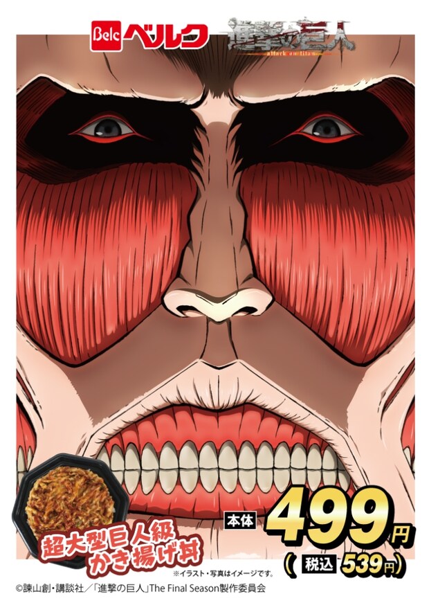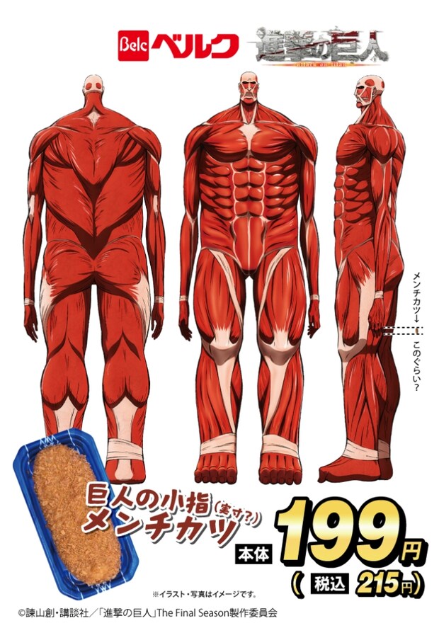 2025年11月6日(木)よりベルク各店(CLBE店舗除く)にてコラボ3商品(「心臓を捧げよ!鶏ハツブロッコリー」「巨人の小指(実寸?)メンチカツ」「超大型巨人級 かき揚げ丼」)を期間限定で販売する。