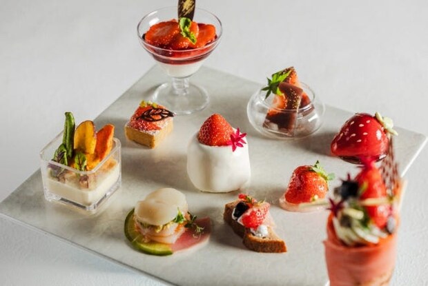 いちごと旬の素材を組み合わせたセイボリー3種類には、「フォアグラフランとパンプキンのフォンダン」、「ホタテと野菜のミルフィーユ いちごのビネグレット」、「ベリーベリーのケークサレ 生ハムのアクセント」がラインナップ。いちごのおいしさが味わえるとともに、塩気のあるメニューはスイーツの合間にひと休みするのにもぴったり。