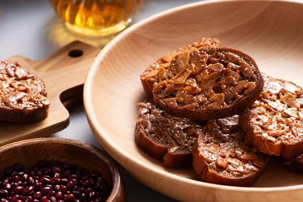 「フロランタンあんラスク」は、厳選した北海道産の小豆かのこと小豆餡を練りこんだフランスパン生地に、ヌガーとアーモンドスライスを丁寧に一つ一つ塗り、カリッとしっかり焼き上げている。
