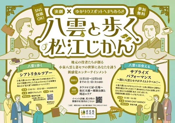 松江観光協会は、11月1日(土)~12月14日(日)の期間の土・日曜日に、松江を愛する役者たちと創る期間限定の観光イベント「八雲と歩く松江じかん」を開催する。