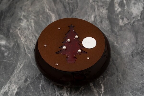 「ノエル・ショコラ・アルブル・ルージュ」4号/12cm 5,832円(税込)は、口どけの良いチョコレートムースと濃厚なガナッシュにフランボワーズのクーリーのフルーティーな酸味が添えられている。柔らかなビスキュイサンファリーヌやザクザクとしたシュトロイゼルが食感のコントラストを楽しませるアクセントとなっている。