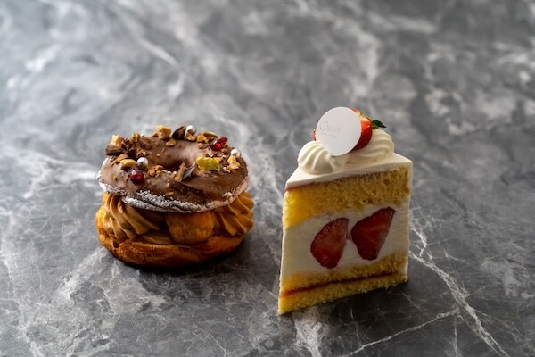「リースセット」(ショートケーキ・リースプラリネ)2,160円(税込)は、こだわりのショートケーキと、焙煎したヘーゼルナッツをキャラメリゼしたプラリネをクレームムースリーヌに加え、サクッと焼き上げたシュー生地に絞ったパリブレストのセット。