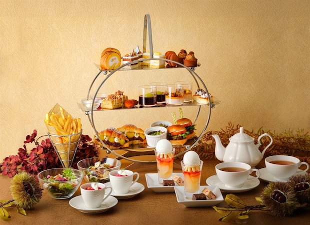 【関連写真】「アフタヌーティーセット~マロン&チョコレート~」他イメージ6枚ティースタンドには、秋限定の「マロンタルト」や大福と栗を包んだ「マロンロール」、「ベイクドチーズケーキ」、「チョコレートマカロン」などのスイーツ9種が並ぶ。栗とチョコレートが織りなす優雅な秋スイーツや、シェフ厳選のセイボリーがバランスよく盛り込まれている。