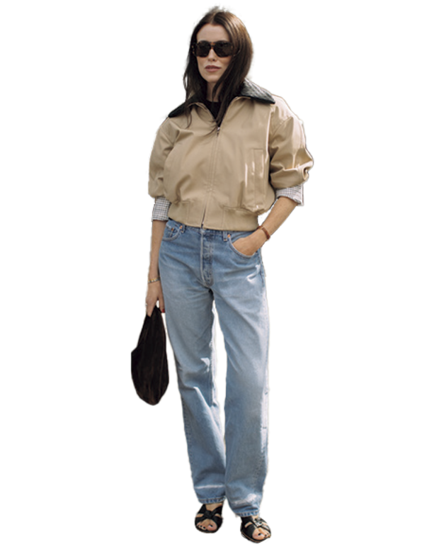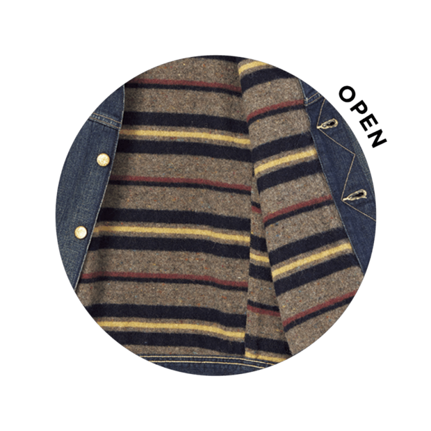 カーハートやバブアーのような、身ごろと襟の素材が異なるワークジャケットブームはデニムにも。女性らしいスカートやモダンなアイテムと合わせれば洒落感UP。