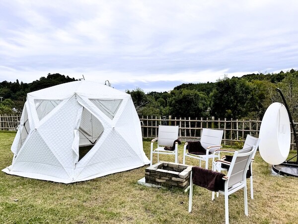 芝生エリアでは焚き火も楽しめ、炎を見ながらホットワインや熱燗で乾杯できる。グランピング風テントも設置し、焚き火×テントで“デイキャンプ気分”を味わえる。