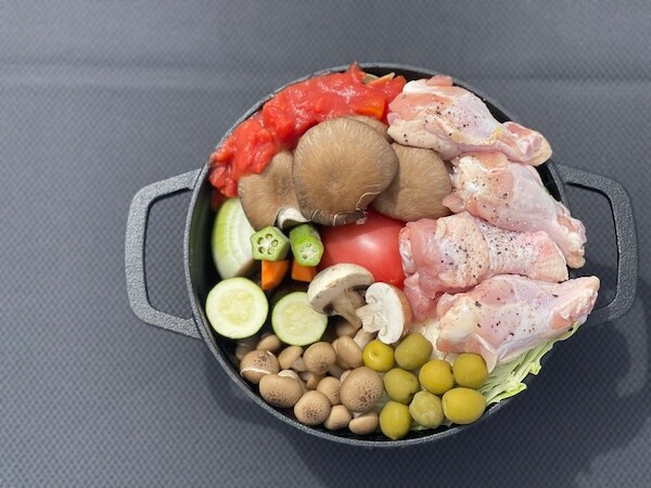 「泉州野菜と備中高原鶏のオリーブトマト煮込み」、