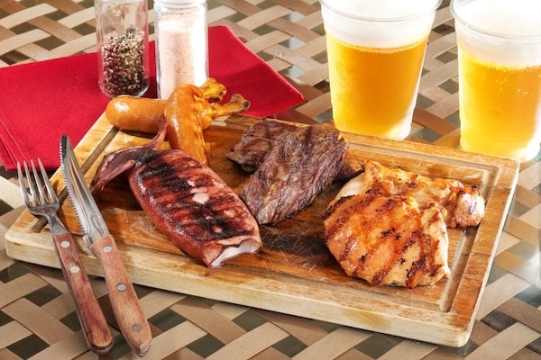 BBQセットは、厚切りカルビ、タンドリーチキン、骨付きウインナー、つぼ抜きイカとなっている。