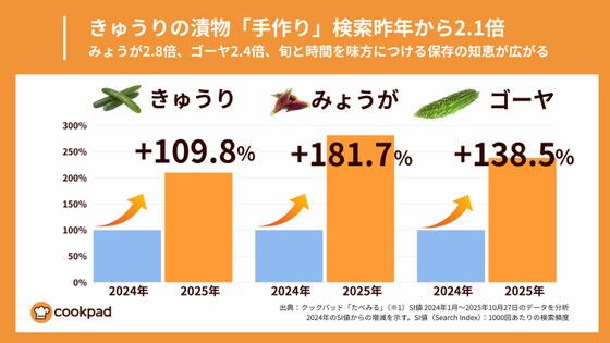 クックパッドは、10月30日の「食品ロス削減の日」(※1)に合わせて、家庭での漬物手作り検索動向を調査しました。漬物の市販価格が上昇する中(※2)、2024年から2025年にかけて「自分で漬ける」選択が急速に広がっており、きゅうりの漬物レシピ検索は前年比2.1倍、浅漬けは1.3倍に増加(※3)。ユーザーコメントの分析では「余った野菜の活用」が支持理由の一つとして挙がっており、「切って漬けるだけ、あとは時間が調理」という昔ながらの知恵が、物価高と食品ロス削減の両面で見直されています。