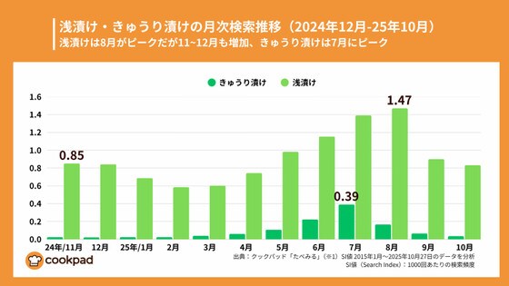 2024年11月から2025年10月までの検索推移を見ると、浅漬けは冬場(11-12月)と夏場(7-8月)の両方でピークを迎え、きゅうり漬けは夏場(6-7月)に集中しています。これは、旬の野菜を使うきゅうり漬けに対し、浅漬けは年間を通じて様々な野菜で作られていることを示しています。