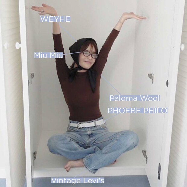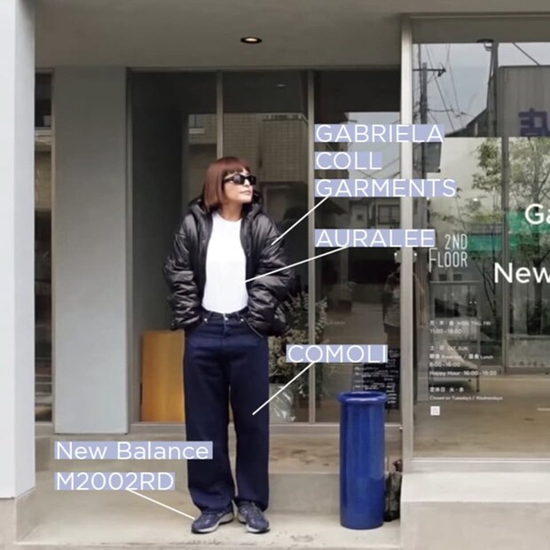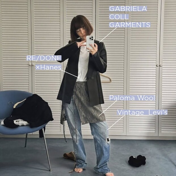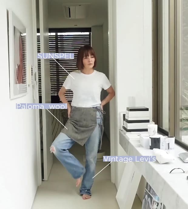 今日改めてインタビュー中に気づいたこと。空間の中にどうやって佇むか? ってことが、“私の思うおしゃれ”だと思っていて。服を着たときの仕草やその空間に差し込む光やムードを含めた状況の中で、どうやってそこに佇むか? それを想像するし、空間を含めたトータルの女性像を作るのがとても好きなんです。毎日のデニムのコーデもそういった“空間の中に佇んでいる感じ”“ここにいるこの人”をイメージして組んでます。自分が空間の中にどう存在するか? リップの色や靴のディテール、髪の毛の動き、デニムのラインやトップスの色も、これから行く空間の中でムードを醸し出し、映えることを大切に考えてます。毎日のファッションを決めるとき、自分のことを“ものすごい引きの絵”で捉えているって最近気がついたの。
