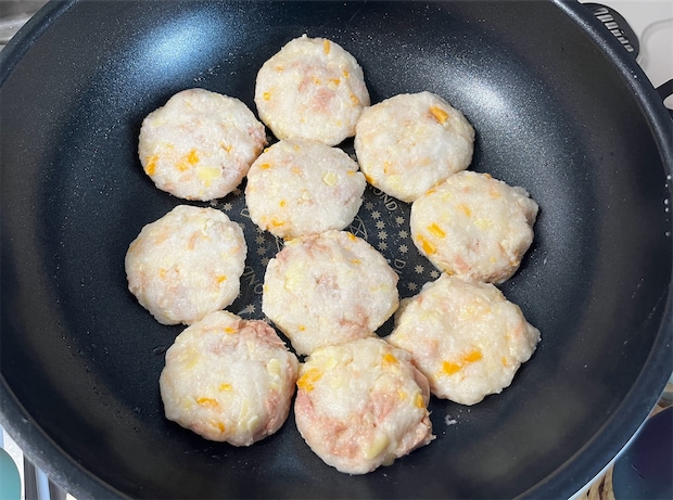 2. フライパンに油(分量外)を薄く引く。1の生地を並べて弱火で約5分焼く。裏返してさらに約3分焼いて、きれいな焼き色がつけば完成。