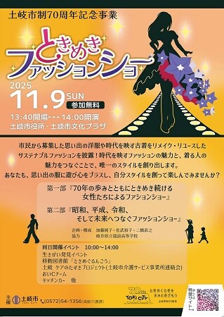 岐阜県土岐市では、11月9日(日)に、高齢者が若い世代、地域とつながり健康でいきいきと暮らせるまちを目指し、市制70周年を記念したイベント「ときめきファッションショー」&「生きがい発見イベント」を開催する。