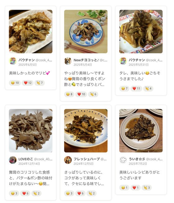 つくれぽ(みんなのつくりましたフォトレポートのこと)でも、「おいしすぎて止まりません。舞茸がこんなにおいしくなるなんて!」「リピしてます!焼き色をつけたところが香ばしくておいしい」といった声がたくさん届いています。