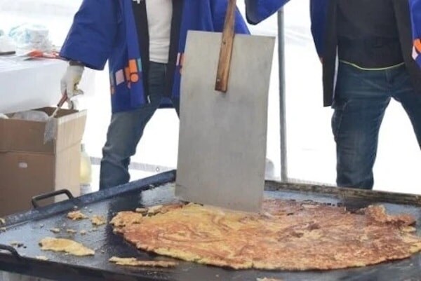 さらに調理パフォーマンスにも大注目の、米粉を使った直径約1mのお好み焼きのカット販売も行われる。