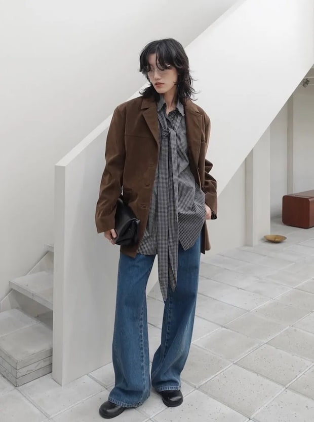 タイ付きのチェックシャツも旬のアイテムのひとつ。デニムとスエードジャケットのメンズライクな組み合わせも、ボウタイブラウスが程よい女性らしさを演出。さらにタイをルーズに垂らすことで“らしさ”漂うこなれムードも。チェックシャツこそのちょうどいいカジュアルさが着こなしのカギに。