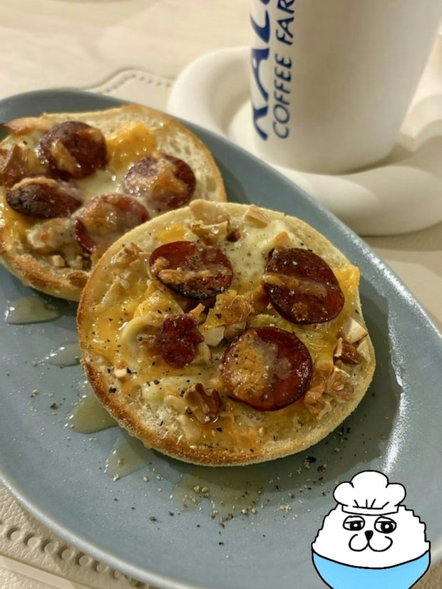 イングリッシュマフィンと聞くとジャムやクリームチーズ、とけるチーズやベーコンをサンドするなどさまざまな食べ方がありますよね。麦ライスさんのレシピでは、3種類のチーズに加えサラミ、はちみつ、黒胡椒にミックスナッツを使用するそう。材料を聞いただけで美味しい組み合わせなのがわかってしまいますよね。