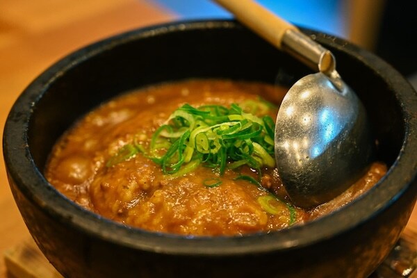 締めに何か…とメニューを見返して、ひときわ目を引くのが「石焼カレー(950円)」。鉄板でジュウジュウ音を立てて登場したカレーは、割烹らしく出汁がきいている…かと思いきや、意外にもスパイスの刺激が本格的。