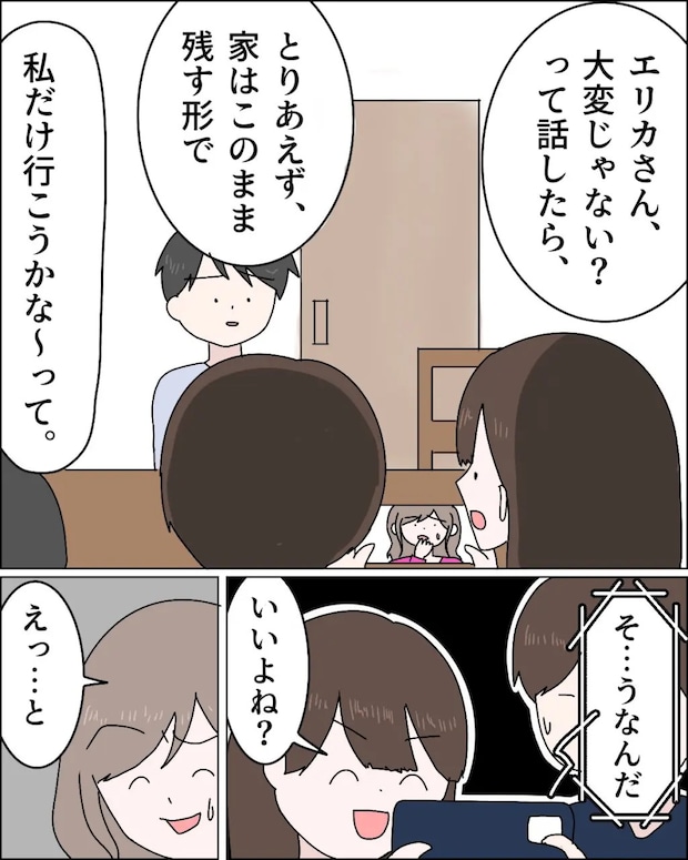 「エリカさん大変じゃない?って話したら、「とりあえず家はこのまま残す形で、私だけ行こうかな~って」ジュリがそう呟くと、「そ・・うなんだ・・」と言葉に影ができたエリカさん。「いいよね?」とジュリが念押しすると、「えっ・・と」と言葉を濁すエリカさんに、