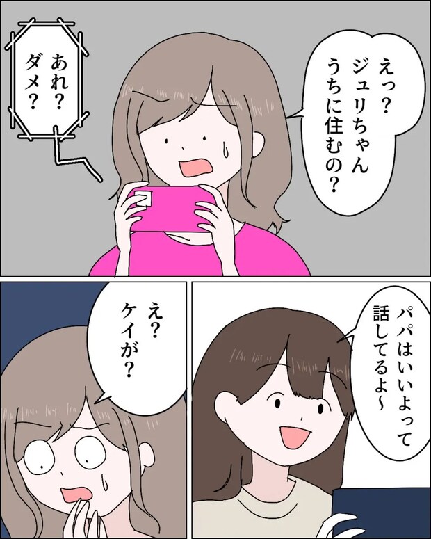ケイさんとエリカさんが住むマンションの方が近いと提案するジュリさんは、学校も塾も近いと提案。すると、「ジュリちゃんうちに住むの?」とエリカさんがビックリ!「あれ?ダメ?パパはいいよって話してるよ~」と伝えると、「え?ケイが?」とエリカさんが動揺しました。