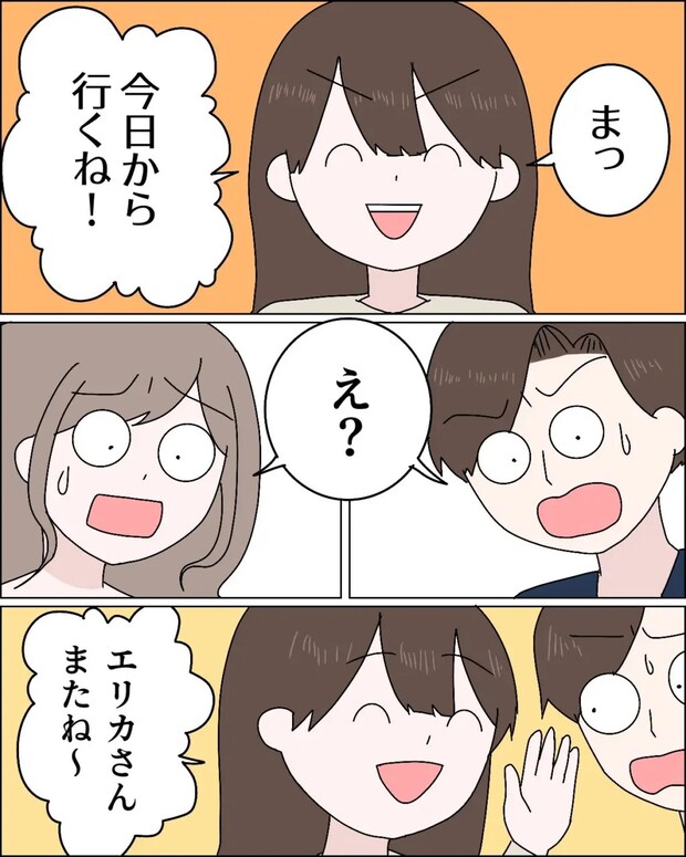 「まっ今日から行くね!」と宣言したジュリ。夫もエリカさんも驚くなか、「エリカさんまたね~」とうれしそうに手を振りました。